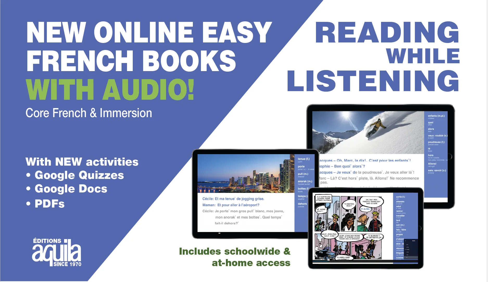 I just purchased a few of the books & audio ebooks for our school. What a great way to cover all 4 strands of the curriculum using these books and audio-visual ebooks by Aquila. Students are engaged!!! They are using technology (which they love; whether the chrome books or computer lab) to access the ebooks. The new curriculum emphasizes the importance of oral communication within the French as a Second Language classroom. I see students using these ebooks to practice their oral French whether at home or at school. Students are getting a faster understanding of the story because they are seeing the story & listening at the same time. In turn, these resources save me time & make my job easier. Kids are finding French fun.