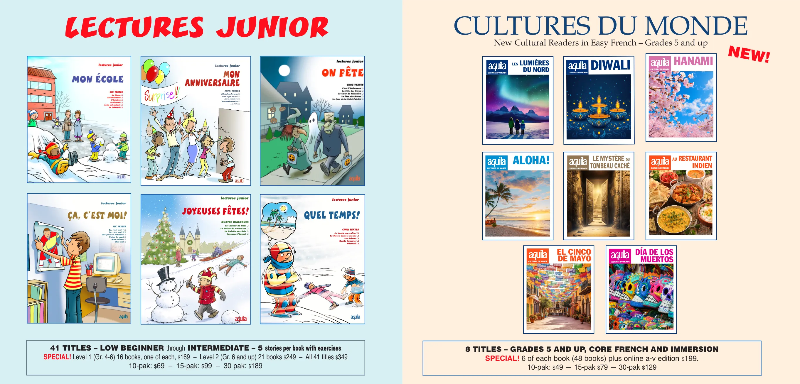As a grade five extended French teacher, I have found that Aquila products are easy to access for students beginning in their study of their second language. The themes are engaging and easy for students to relate to, and the visuals and graphics help to scaffold the reading strategies that students need to build in order to become confident, independent readers.
